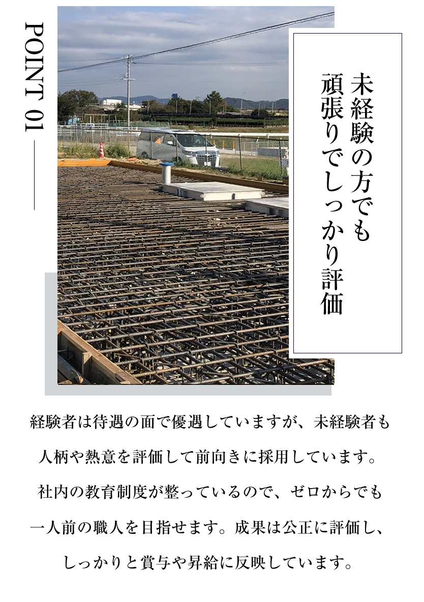 当社は様々な建設工事に携わっていますが、「躯体工事」と呼ばれる工事がメインの仕事になります。建物の安全や仕上がりに直結する重要な工事で、大きなやりがいになる仕事です。電動ノコギリや釘打ち機などの専門的な技術も必要になりますが、 未経験の方でもしっかり指導&フォローいたしますのでご安心ください。どんどんチャレンジしていただければ1〜2年でしっかり技術が身につきます! 経験問わず、やる気のある方は給与に反映していきます!